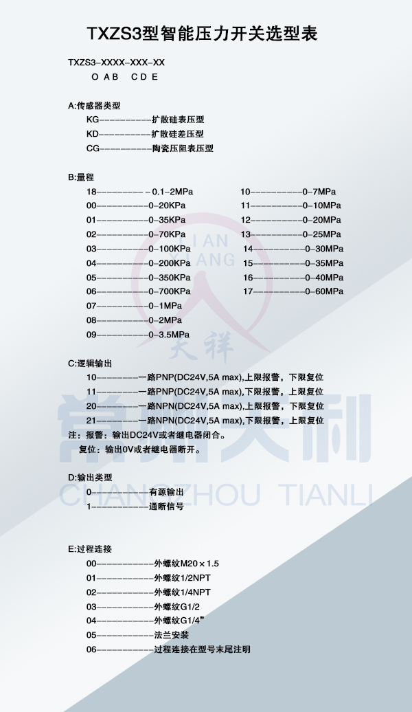 TXZS3智能壓力開關(guān)基本參數(shù)