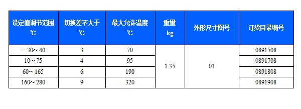 541/7TZ雙觸點溫度開關(guān)采用毛細(xì)管溫包式傳感器,可用于流動的中性氣體和液體介質(zhì)。如果介質(zhì)為腐蝕性,安裝時可選用不銹鋼溫包保護套套在銅質(zhì)溫包外,541/7TZ雙觸點溫度開關(guān)的設(shè)定值可調(diào),調(diào)節(jié)范圍-30~280℃。